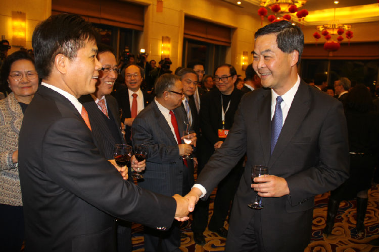 香港特別行政區行政長官梁振英3月4日在北京主持招待港區全國人大代表和政協委員的酒會。梁振英表示,要珍惜目前香港經濟發展基本良好的局面,發揮好“一國兩制”的優勢。當天的酒會除了參加本次兩會的港區全國人大代表、政協委員出席外,特區政府還邀請部分駐北京的香港商會代表和專業人士。這是郭董第二次在北京參加港區的代表委員。