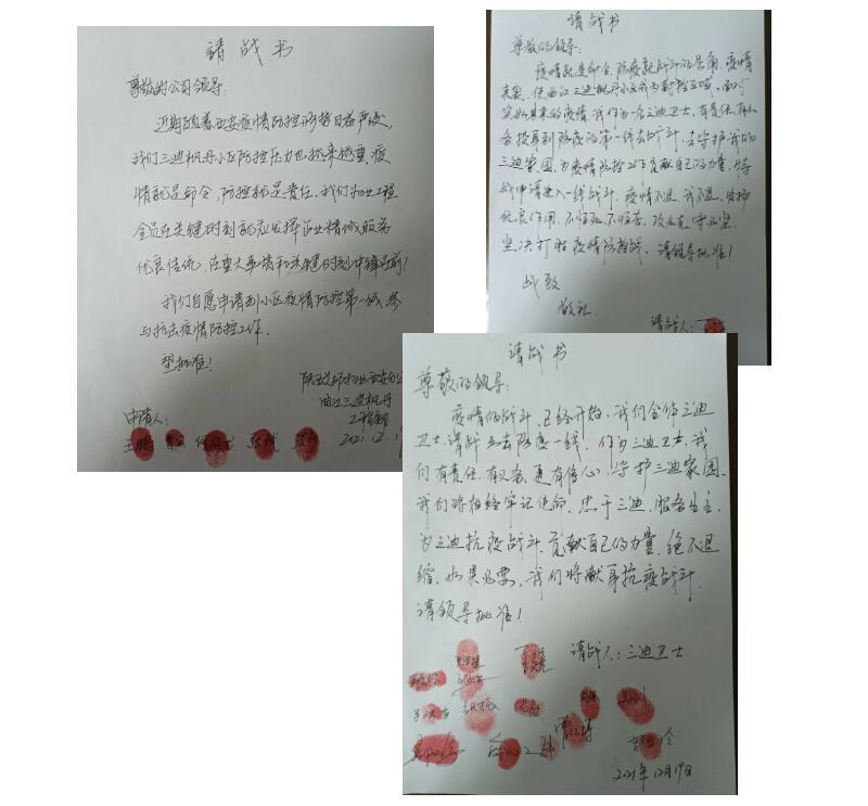 一張張請戰書,是西安“三迪衛士”向疫情發起挑戰的決心。困難面前,三迪人員主動請纓,無私奉獻,自愿沖向沒有硝煙的戰場,詮釋了“勇于擔當”的職業精神。遞交請戰書后,全員待命,聽從區域項目的統一指揮。