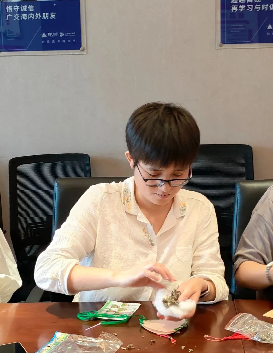 在香囊的制作過程中,大家一步步完成穿針引線、縫合布料、填充藥材、裝飾整理等步驟。大家一邊縫針,一邊討論如何更好更快地縫制香囊,不一會兒,香氣宜人的香囊就在大家的互幫互助中完成了,活動現場彌漫著艾草的清香,沁人心脾。