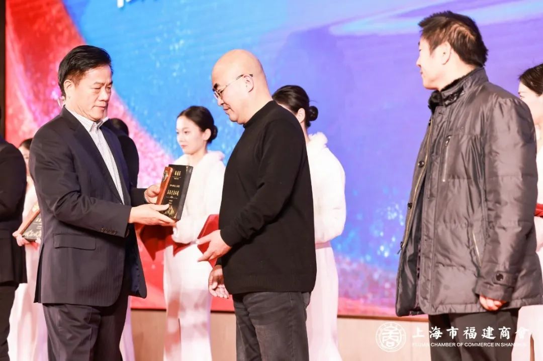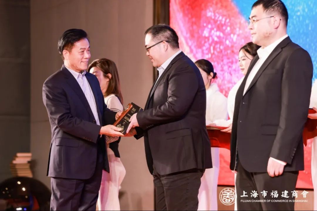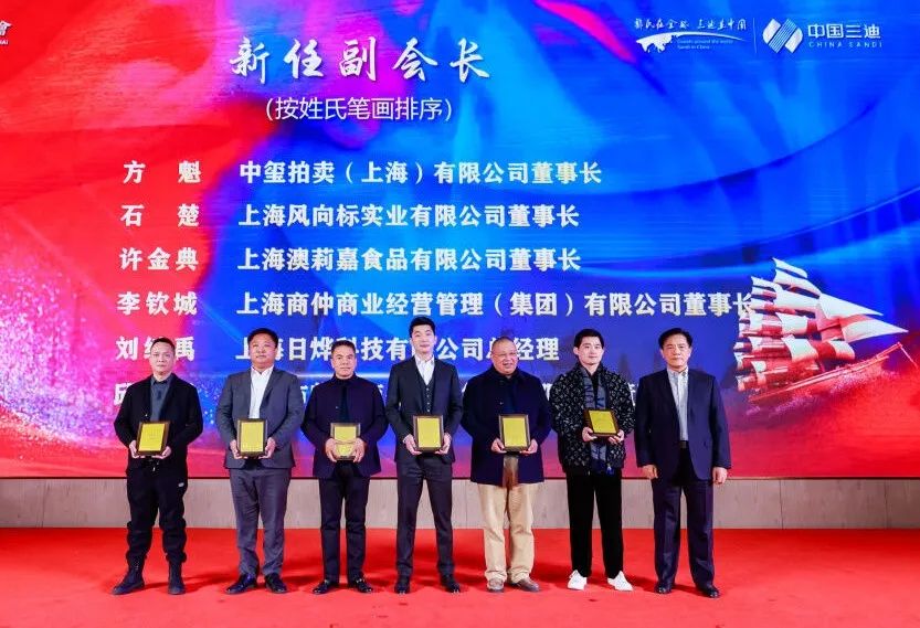 上海市福建商會輪值會長郭加迪向新任副會長中璽拍賣(上海)有限公司董事長方魁、上海風向標實業(yè)有限公司董事長石楚、上海澳莉嘉食品有限公司董事長許金典、上海商仲商業(yè)經(jīng)營管理(集團)有限公司董事長李欽城、上海醫(yī)加醫(yī)科技有限公司總經(jīng)理劉繼禹、廈門市臨家商務服務集團有限公司董事長邱尚振頒牌。