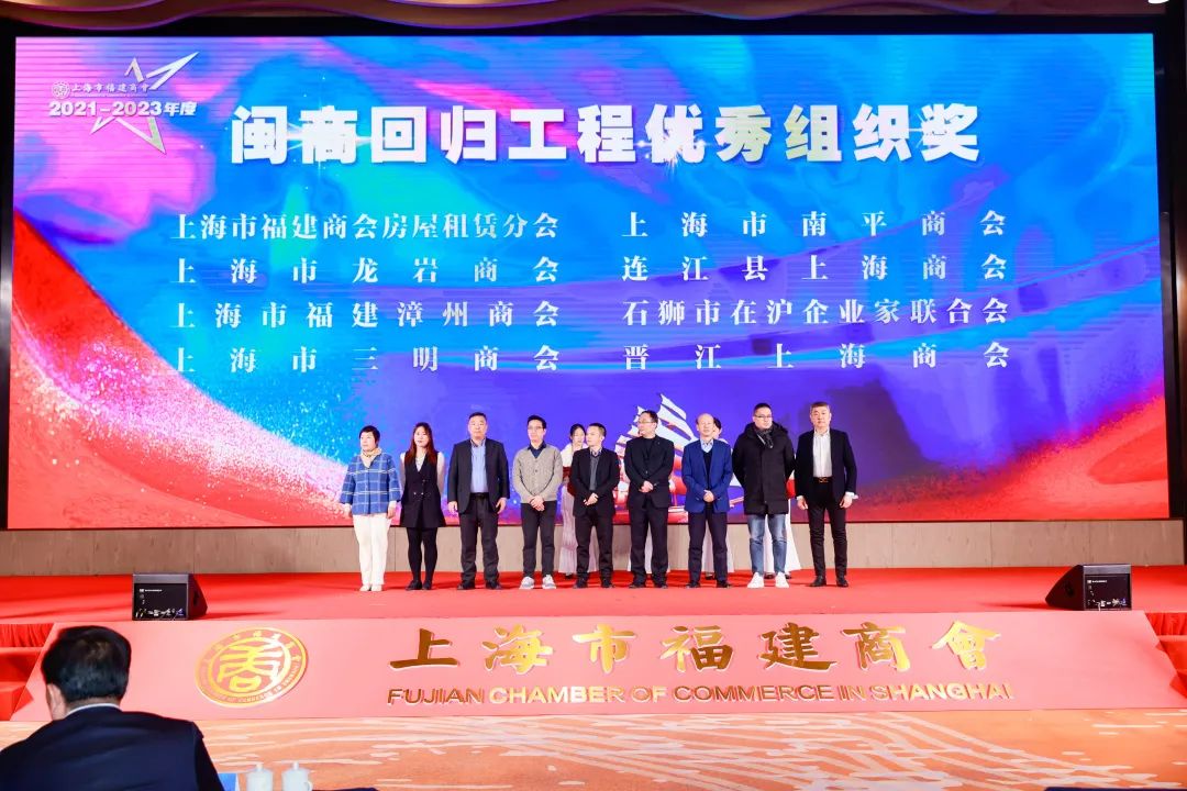 上海市福建商會常務副會長、新海投資集團有限公司總裁吳峰曄,上海市福建商會常務副會長、上海市南平商會會長、上海環(huán)世物流(集團)有限公司首席執(zhí)行官林杰,上海市福建商會常務副會長、上海玉融分會會長、上海大世界(集團)房地產(chǎn)有限公司董事長陳財興,上海市福建商會常務副會長、富春科技股份有限公司黨委書記、董事長繆品章分別向在近幾年中為福建閩商回歸工程做出重要貢獻的16個團體會員頒發(fā)“閩商回歸”優(yōu)秀組織獎頒牌。