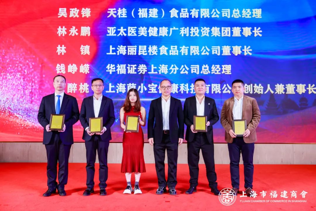 上海市福建商會會長林騰蛟向新任副會長天桂(福建)食品有限公司總經(jīng)理吳政鋒、亞太醫(yī)美健康廣利投資集團董事長林永鵬、上海麗昆樓食品有限公司董事長林鎮(zhèn)、華福證券上海分公司總經(jīng)理錢崢嶸、上海菌小寶健康科技有限公司董事長涂醉桃頒牌。